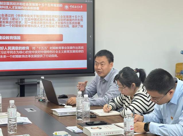 会上,刘海波介绍了支部党员共读《习近平谈治国理政》(第五卷)的有关情况,并领学《中共中央关于制定国民经济和社会发展第十五个五年规划的建议》关于一体推进教育科技人才发展的系统部署和中国科学院党组书记、院长、中国科学院院士侯建国在《求是》杂志发表的文章《一体推进教育科技人才发展》。他强调,要深入学习贯彻习近平总书记关于教育科技人才工作的重要论述,统筹推进学校“十五五”事业发展规划编制工作,充分发挥学科的学术属性和管理属性,完善学科专业设置调整机制,一体推进教育科技人才发展,大力培养国家急需的战略顶尖人才,切实把学习成果转化为干事创业、推动学校事业高质量发展的实际成效。